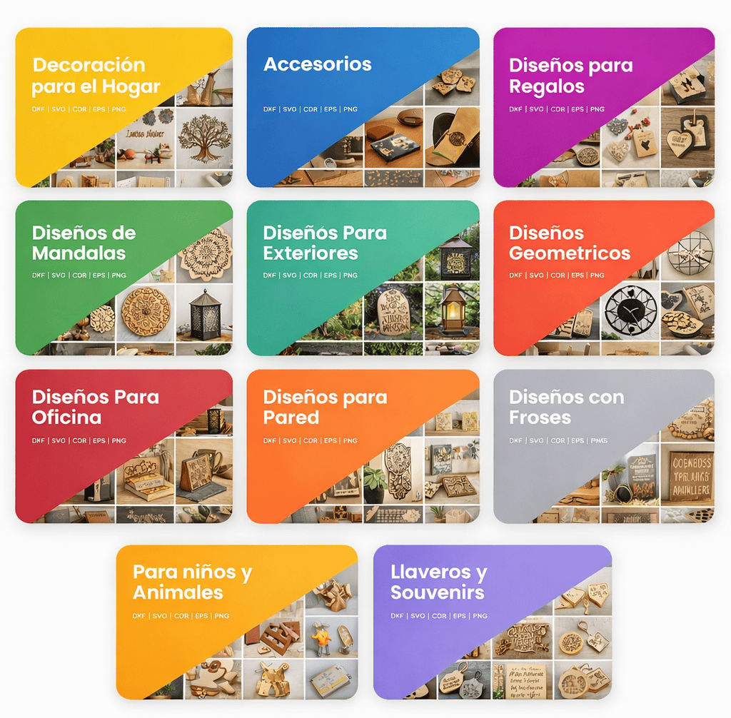 Cada archivo ha sido desarrollado para funcionar con los principales formatos como DXF, SVG, CDR y EPS, asegurando un uso sencillo en distintas plataformas. Además, todos los paquetes incluyen versiones JPG y PNG, brindando aún más practicidad.